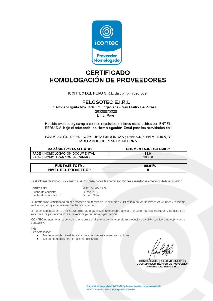 Nos enorgullece anunciar que FELOSOTEC E.I.R.L ha obtenido la certificación como proveedor homologado. Esto garantiza la calidad y confiabilidad de nuestros productos y servicios, beneficiando tanto a nuestra empresa como a nuestros clientes. Estamos comprometidos con la excelencia y la satisfacción del cliente en cada aspecto de nuestras operaciones.