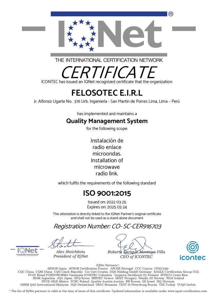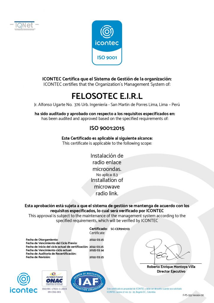 En FELOSOTEC E.I.R.L, estamos orgullosos de anunciar que hemos obtenido la prestigiosa certificación ISO 9001:2015, un logro que refleja nuestro compromiso constante con la excelencia en la calidad y la satisfacción del cliente.